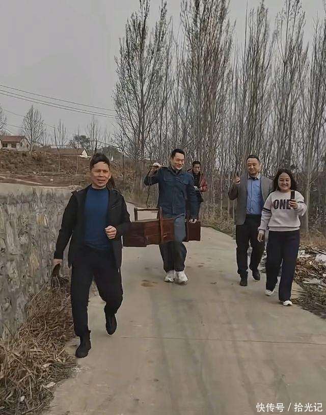 只见他穿着一身很普通的衣服,挑着个扁担,扁担上挂着祭祖用的东西,跟在老家没什么区别。